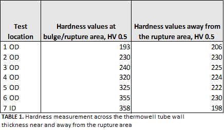 The hardness was also measured across the wall thickness of the polished 2-in.OD thermowell ring samples, extracted at different locations, adjacent to the rupture location at and away from the bulged area at equal distances. The hardness tester was checked by a standard block before measuring the hardness of the tested sample—in compliance withASTM E92. The room temperature was approximately 23°C at the calibration of the hardness tester machine. The hardness values showed higher hardness readings at the damaged area vs.the undamaged zone, which indicated the material exhibited poor ductility at the ruptured area. In addition, the hardness measurement at the rupture area increased. The increase in hardness indicated signs of carburization—as a result of hydrocarbon dissociation—caused by the heat of the combustion fire. The hardness details are described in TABLE 1. Additional hardness measurementswere conducted near the rupture area. The hardness values were reported in the range of 179 HV–188 HV, which is lower than the average hardness value of the unaffected thermowell tube base metal (200 HV–230 HV).