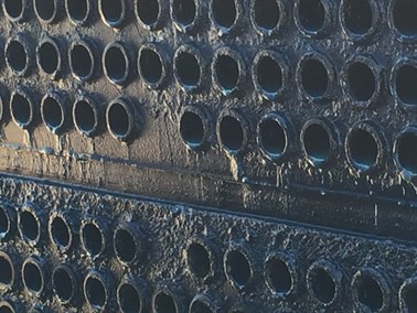 A natural gas processing plant with two condensate stabilizers in South Texas, U.S, was experiencing challenges with fouling in the heat exchangers at both stabilization units. Substantial fouling was observed on both sides of the heat exchangers at both units, affecting more significantly the tube side of the exchangers. These vessels exchange heat between the feed condensate to the stabilizers (tube side) and the bottoms stabilized condensate from the reboilers (shell side). The exchangers with observed fouling at both units were the last of two in series. Tube-side flow blockages (FIG. 3) required shutdowns for cleaning and bundle replacements as frequently as once per week. Fouling was also suspected in the first heat exchangers and the stabilizer reboilers.