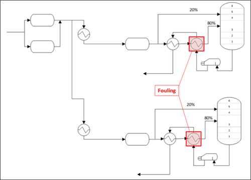 FIG. 4 shows a simplified process flow diagram of the feed to both stabilizer units, and the exchangers where fouling was observed are highlighted. Condensate from two inlet separators was split to the two stabilizer units and sent to heat exchangers upstream of the three-phase separators. Condensate from each three-phase separator was then sent to two exchangers in series to take heat from the stabilizer bottoms prior to entering the tower. Offgas from the two inlet separators and two three-phase separators was comingled, compressed, chemically treated for H2S removal, and sent to a vertical separator for further liquids removal. The offgas was sent to the gas plant, and any liquids that dropped out in the vertical separator were routed back to the front of the liquid side of the plant for processing along with the feed condensate from the field. Overflow from liquids and pigging tanks was also sometimes routed to the stabilizer feed.