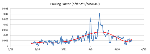 It can be observed from FIG. 6 that the fouling factor began to rise more rapidly at the end of March, indicating a rise in contamination ingression and fouling. The fouling rate began to decrease and cease completely as the fouling factor stopped increasing; in early April, the fouling factor actually declined. The decline in fouling factor suggests that heat transfer was increasing, therefore foulant was likely being removed from the exchanger and moving downstream to the stabilizer.