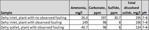 The level of ammonia was approximately six times higher at the dehydration bed inlet at the plant with fouling issues compared to the plant without observed issues. This result suggested that ammonia was contributing to fouling at the plant. The level of ammonia was lower in the dehydration bed outlet at the plant with fouling issues, suggesting that deposition or adsorption was occurring in the mole sieve beds. Also of note, the level of sulfides and carbonates was lower at the plant without fouling issues, which showed that the presence of ammonia was the driving force for potential salt precipitation.