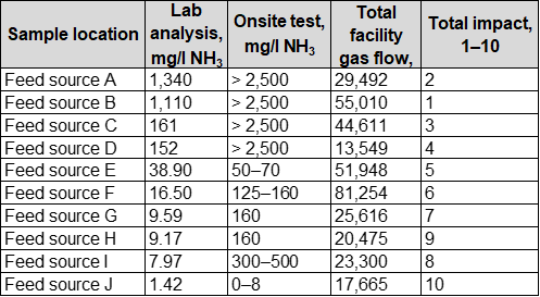 The level of ammonia in each feed source varied significantly—two sources in particular were measured to contribute the majority (> 80%) of ammonia contamination. Four other sources contained a significant degree of ammonia (> 1% of the total), and four additional sources contributed a negligible amount of ammonia. Based on these findings, additives used at the feed sources with high ammonia levels were investigated further. Those additives with potential ammonia or ammonia byproducts were discontinued or replaced with different chemistries.