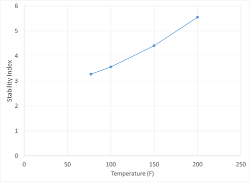 FIG. 7 clearly indicates that the stability index not only has positive values, but an increasing value with increasing temperature. This increase is indicative that calcium carbonate is less soluble as temperature increases and more prone to precipitation. If water from the separator was carried over to the downstream heat exchangers, the increase in temperature was likely to cause scale formation. FIG. 7 also shows what degree of an acid treatment would be required to prevent scaling: for example, the pH would need to be lowered by 5.5 to prevent calcium carbonate precipitation at 200ºF.