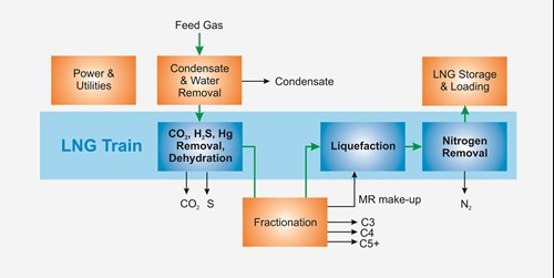 FIG. 1. Typical LNG processes—where critical machines are monitored—shown in blue (part of the LNG train) and orange (other plant sections).