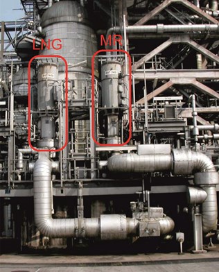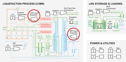 FIG. 2. Typical critical machines monitored in the LNG processes. The liquid expanders are circled in red.