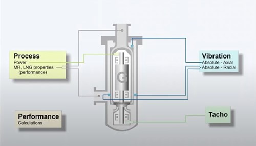 How is the liquid expander monitored? An overview of the monitoring techniques is shown in FIG. 4. This includes vibration, the phase-reference process data and performance-monitoring calculations.