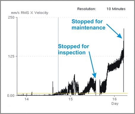 Takeaway. Oftentimes, when one thinks of machine condition monitoring, one thinks of detecting faults at an early stage of development due to wear and degradation of machine components. For those users who feel their machines operate at a constant load and speed, they may feel that failure is predictable, and they do not need special condition monitoring functionality. However, there are many other kinds of faults that can occur that lead to premature failure, such as manufacturing defects, assembly error, lack of cooling or lubrication and even process-related conditions such as overpressure and cavitation, among others. In this case study, it was an operational fault during start-up. Although machine component degradation and wear may be straightforward as far as detection and diagnostics go, it may be more complicated for the other types of faults mentioned. These may be more difficult to detect early with basic measurements and require more expertise support to diagnose, as was demonstrated in this case study.