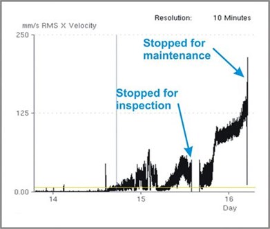 FIG. 6. Accelerometer velocity amplitude trend showing the increase in vibration from the first start-up after an overhaul until the last shutdown for maintenance.