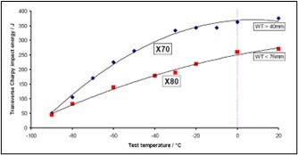 The above impact properties of high-strength API 5L Grade X70 pipe was found to be in line with literature review. Research works revealed that Grade X70 steel could achieve a high-toughness property of about 350J absorbed energy at 0°C, which is considered high value well above typical requirements, as shown in FIG. 3. In addition, the transition temperature between brittle and ductile failure was determined: a minimum required 80% shear area was achieved in the tests. Based on this approach, the transition temperature for Grade X70 material was approximately –60°C.3