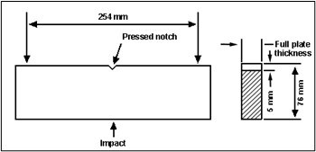 Additionally, drop weight tear testing (DWTT) was carried out on welded pipes supplied by Vendors 3 and 4 at 0°C. The test results show that 100% ductile shear for the test specimens was obtained. The objective of DWTT as a material characterization test is to assess the susceptibility to brittle fracture and to ensure crack arrest in pipelines. In this test, the specimen of the full material thickness has a shallow notch and is loaded in three-point bending, as shown in FIG. 4. Series of specimens can be broken under impact loading at a wide range of temperature and the proportions of ductile fracture on the fracture surfaces are subsequently measured. In this way, unlike the Charpy V-notch test, a transition curve of percentage shear vs. temperature is constructed for the material.
