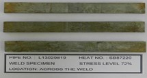 SSC testing was also conducted on the experimental pipes in accordance with ASTM G39 and NACE TM0177-2015. Four-point bent beam tests were carried out in Solution-A (5 wt% NaCl and 0.5 wt% acetic acid in distilled water) of 46 liters (l) solution volume. This test investigated the SSC susceptibility of API 5L Grade X70 pipes. The nominal dimensions of the four-point bent beam specimens are 5 mm x 15 mm x 115 mm, which were surface prepared to 600 SiC grit finish. The specimens were taken from base metal and across the weld joints.