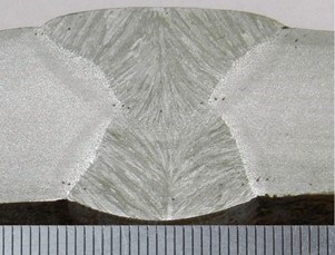 In general, the overall weld and HAZ hardness can be controlled to an acceptable level due to the high heat input induced by the submerged-arc welded (SAW) process. Localized hard spots can arise in excess of 300 HV due to insufficient mixing of flux in the weld molten metal. This relatively high localized hardness did not cause SSC mechanism in constant deflections tests.10 FIG. 5 shows a macrostructure (i.e., a magnification of x 10) of Supplier 3’s welded pipe and the hardness indentations through the pipe wall thickness.