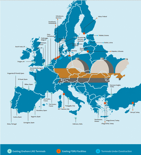 Governments to the rescue. Europe’s and the European Union’s (EU’s) dependence on Russian natural gas was a controversial and highly debated subject long before Russia’s invasion of Ukraine. EU energy security supplies have been high on the European Commission’s (EC’s) agenda for many years, but the commission largely left the development of regasification capacity within the EU to market forces. There has been limited financial support for LNG projects from either the EU or the Governments of EU member states. The EC did allow “state aid” (basically government support to a project that creates an advantage over its competitors) to be provided to LNG import projects in Lithuania (Klaipėda FSRU) and Croatia (Krk Island FSRU), which were strategically important to supply regasified LNG into countries in Eastern Europe that were heavily (in some cases entirely) dependent on Russian gas. However, examples of state aid to EU LNG import projects were otherwise few and far between.