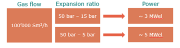 For example, a PLD station with a 100,000 Sm3/hr gas flow and an expansion ratio from 50 bar to 5 bar, around 5 MWe of electricity could be produced using a configuration with the authors’ company’s high-speed axial turbine. With an expansion ratio of 50 bar to 15 bar, approximately 3 Mwe of electricity could be produced (FIG. 3). This solution achieves an efficiency of 80%, while the average efficiency of standard turbines employed in these systems is approximately 70%.