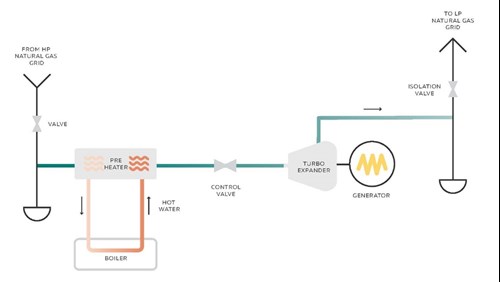This unused energy can be efficiently recovered to produce zero-emissions electricity through a gas expander. In this system, a heat exchanger for gas preheating is positioned upstream of the expander, while the PLD station’s throttled valves are replaced with the expander (turbine). A generator is coupled with the expander to produce electricity while achieving, at the system’s outlet, the desired pressure and temperature for natural gas distribution.