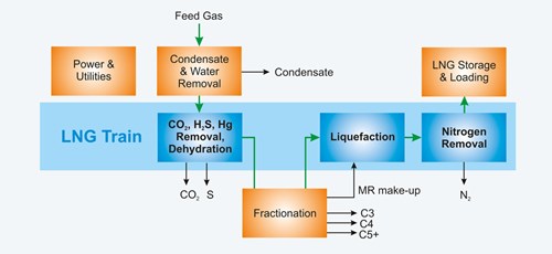 FIG. 1. Typical LNG processes—where critical machines are monitored—shown in blue (part of the LNG train) and orange (other plant sections).