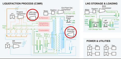 FIG. 2. Typical critical machines monitored in the LNG processes. The liquid expanders are circled in red.
