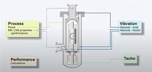 How is the liquid expander monitored? An overview of the monitoring techniques is shown in FIG. 4. This includes vibration, the phase-reference process data and performance-monitoring calculations.