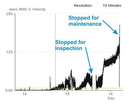 As seen in FIG. 6, the vibration level increased after the first startup. The expander was shut down and immediately restarted. Afterwards, the vibration resumed as before and was shut down a second time for inspection. No problem was found, so it was started up a third time and again the vibration increased, this time a little more dramatically. Finally, the machine was stopped for maintenance, and a specialist was called in to perform an RCA of the problem.