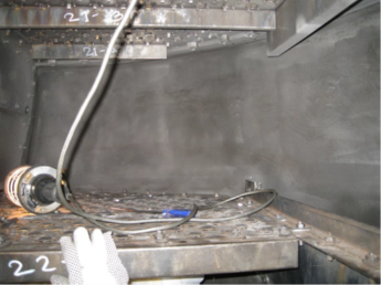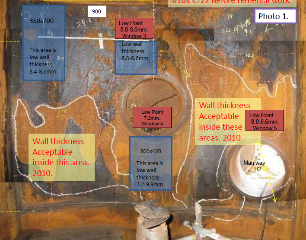 The inspection. Following the application, the amine regeneration column was closely monitored and inspected both externally and internally to demonstrate that the remaining shell pressure boundary was maintained (FIG. 4). After two years the wall thickness had not changed so the asset owner subsequently cancelled the order for the new column and continued operation.
