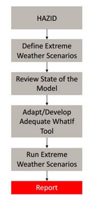 Extreme weather events are herein defined as meteorological events with a 30% increased intensity and coverage from the maximum recorded event, in accordance with a Canadian advisory for future planning. Extreme weather events cannot be readily incorporated into existing risk models due to the high uncertainty of their likelihood, and the lack of meaningful lagging/leading indicators. The proposed climate change risk management framework, shown in FIG. 1, consists of speculative “What if?” scenarios of extreme weather events with an emphasis on consequence assessment.