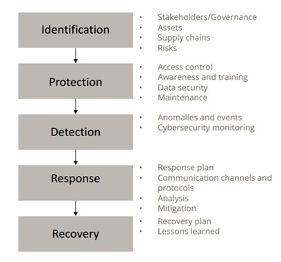 Cyber-attacks can either invade and control internal control systems (ICSs) seeking to compromise business continuity, or target sensitive data on business or enterprise networks that could impact current and future ventures. PIMSs are primarily concerned with attacks on ICSs. API Standard 11649 provides a framework for pipeline ICS cybersecurity risk management, which is an adaptation of the wider application framework published in NIST SP 800.37.10 The API framework kept all the elements of the NIST framework, as illustrated in FIG. 3.
