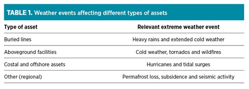 When climate change has been identified as an active threat, the integrity team should define the extreme weather events to be modeled. TABLE 1 presents a non-exhaustive list of common extreme weather events to consider, dependent on the type of asset and location.