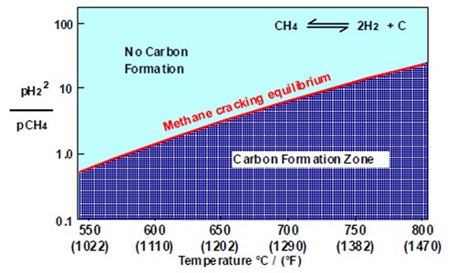An equilibrium line, relating gas composition and temperature, can be drawn for each of the reactions to show the carbon formation zone. FIG. 1 shows the methane cracking equilibrium (Eq. 6) line for the range of temperatures typically seen in a reformer.