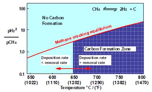 However, the rate of carbon laydown is a function of numerous conditions, such as the catalyst activity, the degree of sulfur poisoning and the heat input to the tubes. The rate of laydown is more likely to vary compared to the rate of carbon removal; therefore, the selected catalyst should have appropriate activity or alkali promoters to ensure that the carbon removal rate is faster than the carbon formation rate, which would result in net-zero carbon laydown.