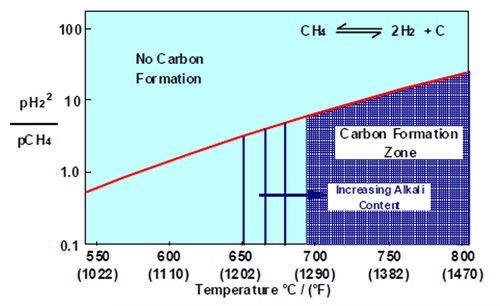 At low catalyst temperatures [600°C (1,110°F)], low-density filaments of carbon are formed in large numbers. These can generate sufficient force inside the catalyst pores support to shatter the pellet. At higher temperatures [650°C–700°C (1,200°F–1,290°F)], a high-density platelet form of carbon is produced, which would have a significant adverse effect on the steam reforming activity by encapsulating the active catalyst surface. Any further increase in temperature [> 700°C (> 1,290°F)] causes a dramatic decrease in the rate and quantity of carbon deposition.