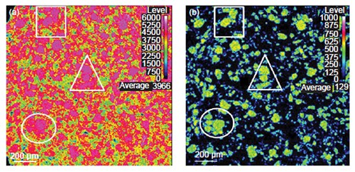 FIG. 4. EMPA images showing aluminum (left) and potassium (right) distribution in a catalyst support highlighting areas of K-Al reservoirs.