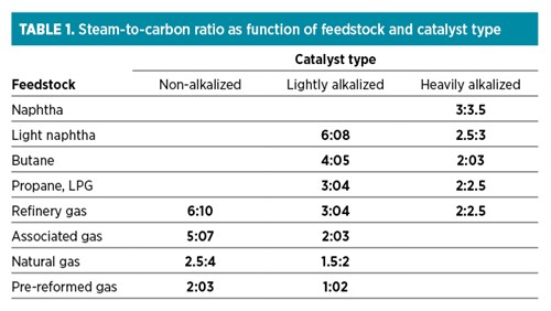 TABLE 1 shows steam-to-carbon ratios that can be applied depending on the feedstock used and the type of catalyst selected.5 The catalysts are divided in three groups: