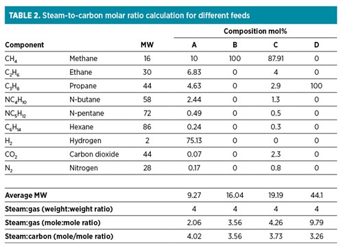 Steam-to-carbon ratio calculation. The steam-to-carbon molar ratio is dependent on the steam molar flow and carbon molar flow from the hydrocarbon feed (TABLE 2).5 To calculate the steam-to-carbon ratio, the steam and feed mass compensated flow and composition analysis are needed.