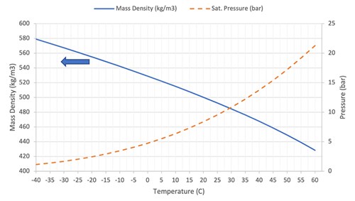 It should be noted that the worst conditions are the fire cases during the winter (at the lowest temperature) and when the tank is full. For this case, the designer must estimate a specific saturated liquid volume at the relieving and minimum site temperatures to estimate the maximum expected liquid expansion before relieving via a PSV. Process engineers may use the minimum average temperature (instead of the minimum recorded temperature) when sufficient justifications are available.