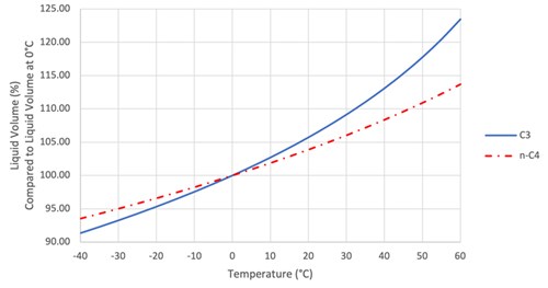 FIG. 2 represents saturated liquid volume at actual temperature compared to saturated liquid volume at 0°C for propane and n-butane. For example, at 30°C, saturated liquid propane has a saturated liquid volume of 109.1% compared to the saturated propane liquid volume at 0°C; and at 30°C, saturated liquid n-butane has a saturated liquid volume of 106% compared to the saturated n-butane liquid volume at 0°C. This means that the LPG specific volume at 30°C is 106%–109% of the LPG specific volume at 0°C. This figure can only be used for rapid estimations.