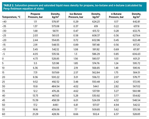 As explained above, fluids in pressurized storage tanks are in equilibrium with relevant vapor. TABLE 2 shows the required basic data related to propane, iso-butane and n-butane at equilibrium conditions.