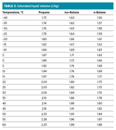 TABLE 3 was generated by calculating the specific volume of saturated liquid (l/kg). This table can be easily used to evaluate the maximum allowable fill volume. Examples for the pressurized storage of propane are discussed in the following sections.