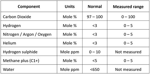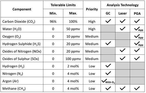 TABLE 1. This table lists the gases typically measured in CCUS applications and the analysis technologies available to monitor them. Where the measurement is listed with a App, the suitability of the technology is dependent on the application.