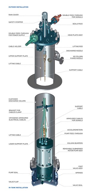 In contrast to the ARTIKA Series, which is mounted directly at the bottom of the tank or inside a cryostat, the ESK-IMO retractable pump is installed inside a column that is isolated from the rest of the tank by a foot valve. In this way, the liquefied natural gas (LNG) remains confined in the tank outside the column, allowing the pump to be removed by opening a cover at the top of the column.