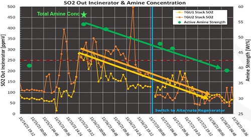 FIG. 1 shows the treating history around the time of the solvent purge-and-replacement event. Prior to this, one TGTU was producing about 100-ppmv SO2 in the stack gas, while the other produced only 50-ppmv SO2. The cause of the change was quickly discovered: the operators had forgotten to dilute the virgin solvent with H2O, so the purged volume (40 wt% amine) had been replaced by an equal volume of pure, undiluted solvent. This resulted in the solvent strength increasing to 57 wt%, which caused the SO2 emissions to increase to 350 ppmv–450 ppmv. Had this been allowed to continue, the sulfur units would have been in violation of environmental regulations.
