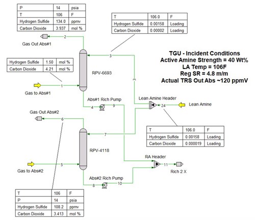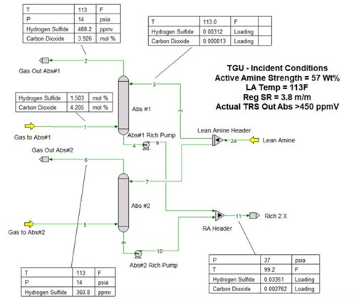 What controls treating in TGTUs. The performance of H2S removal in a tail gas treater is almost invariably determined by lean amine acid gas content (i.e., unless the tray count is very low, TGTU absorbers are usually lean-end pinched with respect to H2S). Their performance is controlled by the concentration of acid gases in the lean amine. In this case, however, the absorbers contain only 13 trays each, so there is room for some degree of additional mass transfer rate limitation. Operators and engineers are used to thinking of acid gas content of solvents in terms of acid gases loading (i.e., moles of acid gas per mole of total amine). However, when comparing two amine solutions of differing strengths, acid gas content should be compared based on actual concentration, not on the values of the acid gas loading. Two solutions of a given amine under identical conditions of temperature, pressure and loading but with different strengths do not have the same acid gas (molar) concentrations, and they will not exhibit the same equilibrium partial pressures of the acid gases.