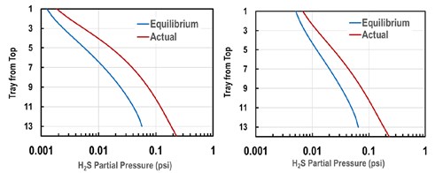 FIG. 4. Simulateda actual and equilibrium H2S partial pressure profiles in Absorber 1 (actual 13-tray count) at 40 wt% amine (left) and 57 wt% amine (right).