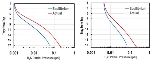 FIG. 5. Simulateda actual and equilibrium H2S partial pressure profiles in Absorber 1 (tray count increased to 18) at 40 wt% amine (left) and 57 wt% amine (right).