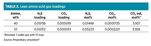 When controlled by lean amine quality as it is with a lean-end pinch, TGTU performance has more to do with regenerator performance than with the absorbers themselves, although the problem presented here could be resolved by focusing just on the absorbers. TABLE 2 shows that the lean amine H2S concentration is 3.6 times higher in the 57 wt% solvent than in the 40 wt% case, but only a factor of two times higher in terms of loading. It may be of interest to note that CO2 in the lean amine is only minimally affected by the solvent strength. This solvent does a superb job rejecting 97% of the CO2 and absorbing nearly 97% of the H2S from the tail gas.