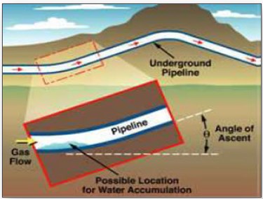 The first critical inclination angle site occurred within the first 40 m of the pipeline length (FIG. 2), immediately downstream of the biogas production facility. Furthermore, since the line frequently has no flow, water normally restrained at the first critical inclination angle site will gravitate upstream back toward the pipe inlet during periods of no flow.