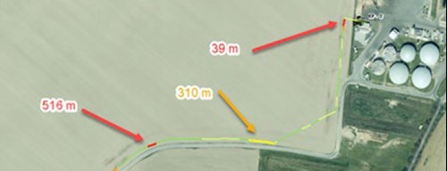 The anticipation of critical inclination angles in this line is influenced by the comparatively low gas flowrates, yielding predictions with critical inclination angles below 2° (FIG. 1). During periods of zero biogas flow, the critical inclination angle is projected to be zero. The elevation profile of the line exhibits a relatively flat trajectory in the initial few kilometers, subsequently descending towards the outlet. A subtle undulation, characterized by a slight rise and fall, is observed before reaching the termination point of the line.