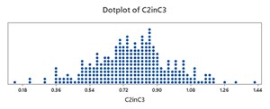 - Variation (control limits): The control limits for the I-MR chart are the upper control limit (UCL) at 1.198 and the lower control limit (LCL) at 0.337. Since all the plotted points are between these control limits, one can infer that the historical variations in C2 concentration were within the expected range. However, a wider range between the UCL and LCL would indicate higher variability, and a narrower range would suggest tighter control.