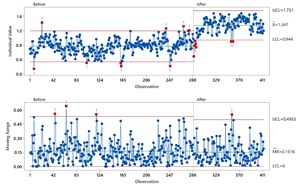 The individual moving range (I-MR) chart for C2 in C3 shows the performance before the visualization tool was implemented: