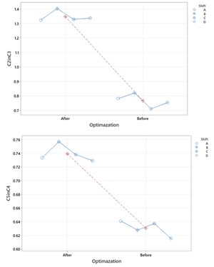 Shift performance before and after. The implemented visualization tool demonstrably improved C2 concentration in C3 production. The average level—represented by a shift in the line graph—has moved significantly closer to the target of 1.4. Additionally, it is likely the tool also reduced performance variability. Interestingly, this improvement was not uniform across all shifts. While Shift B previously had the second-lowest performance in optimizing the C5 in C4 KPI, it has now become the best-performing shift. This suggests the visualization tool had a particularly significant impact on Shift B's ability to achieve the desired C5 concentration (FIG. 4).