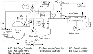 “What if?” analysis. To answer these questions, the following example uses a “What if?” methodology for a fixed-speed centrifugal compressor (motor- or gas turbine-driven). The process flow diagram (PFD) indicating the compressor’s typical control system, including the anti-surge control, is shown in FIG. 1.